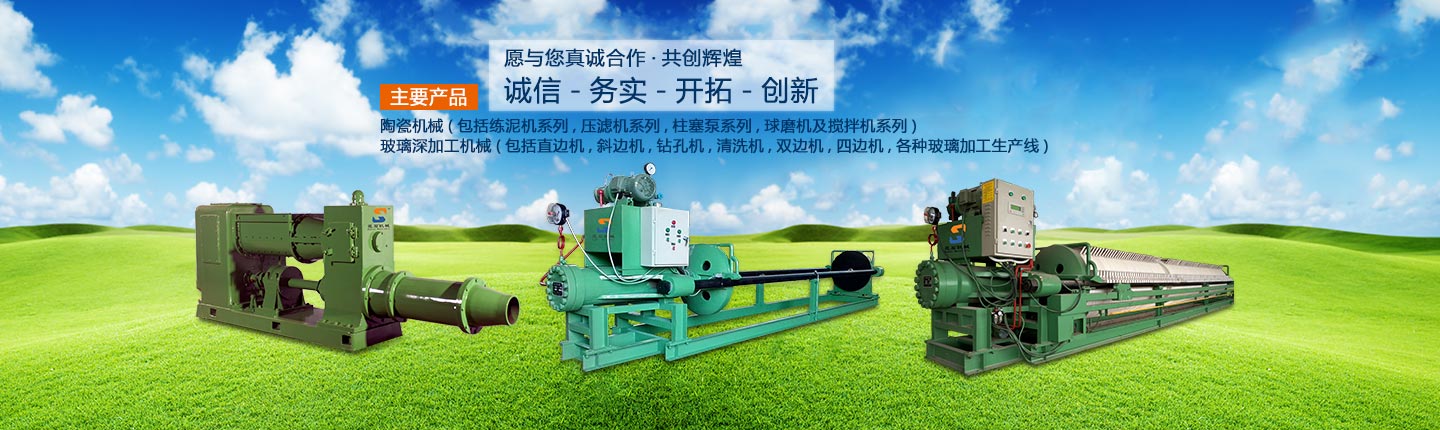 主要產(chǎn)品有:陶瓷機(jī)械(包括練泥機(jī)系列、壓濾機(jī)系列、柱塞泵系列、球磨機(jī)及攪拌機(jī)系列)玻璃深加工機(jī)械(包括直邊機(jī)、斜邊機(jī)、鉆孔機(jī)、清洗機(jī)、雙邊機(jī)、四邊機(jī),各種玻璃加工生產(chǎn)線)